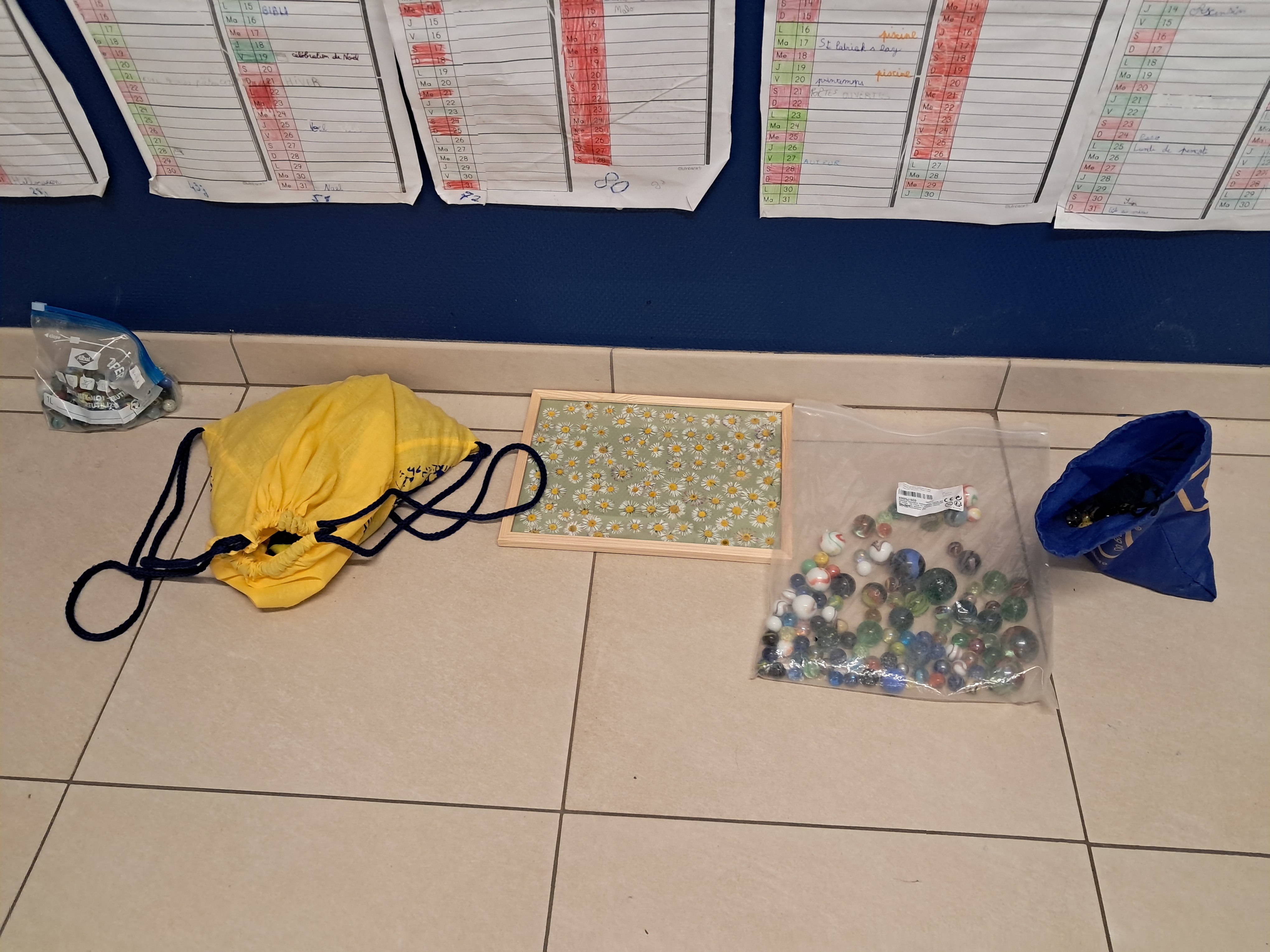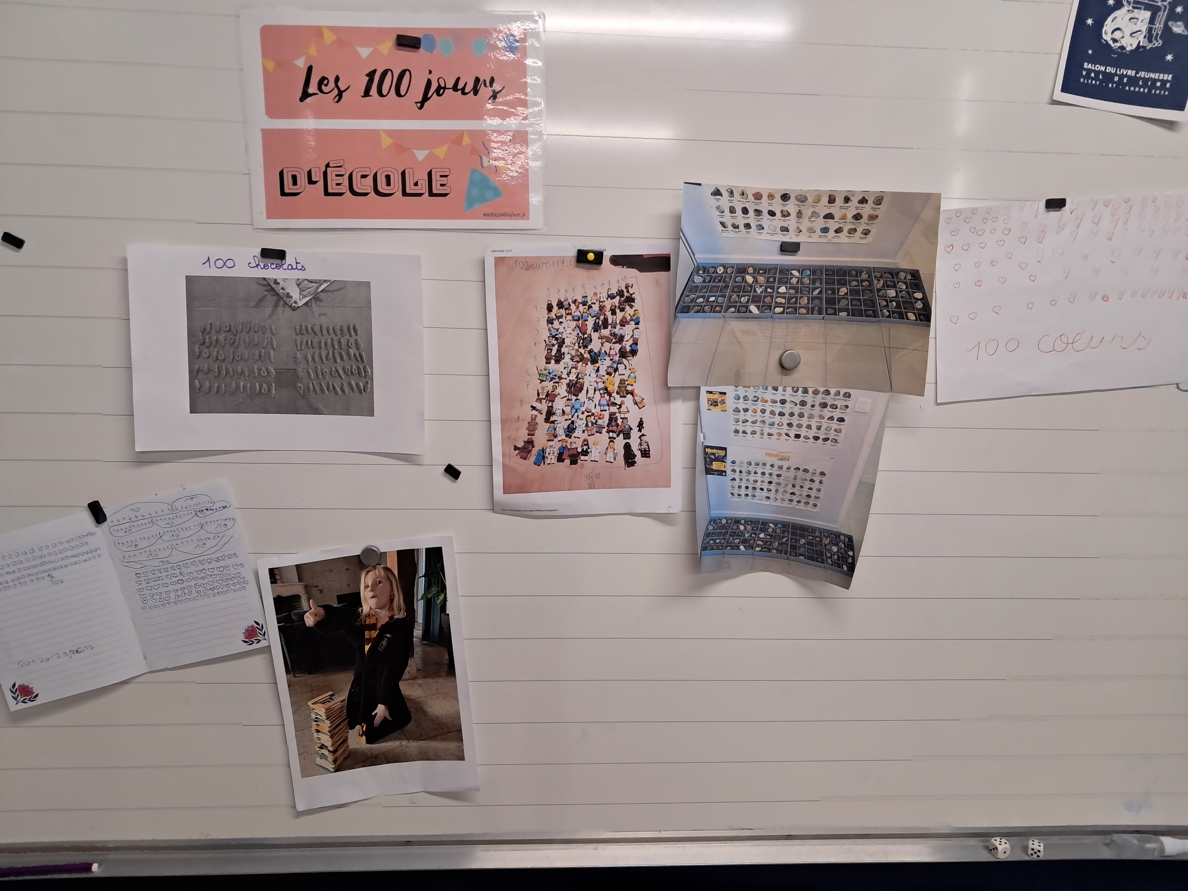 Musée des 100 avec les collections des élèves : 100 pâquerettes, 100 billes, 100 cartes pokemon...